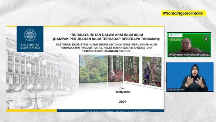 Wakil Dekan Fakultas Kehutanan Universitas Gadjah Mada (UGM), Prof. Widiyatno, menyampaikan hutan berperan penting menjaga stabilitas iklim, ketersediaan air, dan keberlanjutan ekosistem. Dampak perubahan iklim, ujarnya, kini semakin terlihat melalui banjir, perubahan musim, dan penurunan sumber air.