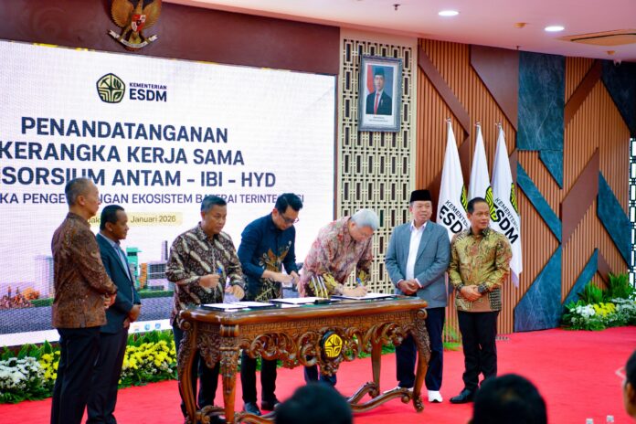 Penandatanganan kerangka kerja sama ini, sambung Bahlil, dilakukan oleh PT Aneka Tambang Tbk (ANTAM), PT Industri Baterai Indonesia atau Indonesia Battery Corporation (IBI), bersama mitra strategis global Zhejiang Huayou Cobalt Co., Ltd. untuk mempercepat pengembangan ekosistem baterai terintegrasi di Indonesia.