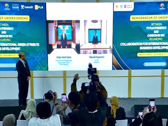 The MoU was formally signed by PLN Executive Vice President for Corporate Business Development and Investment Abdan Hanif Satria and Carbon EX CEO Shunsuke Takeda through a pre-recorded video, which was aired during the Seller Meet Buyer session at the Indonesia Pavilion at COP30 UNFCCC, Belém, Brazil, Thursday (Nov. 13, 2025). The signing was witnessed in person by PLN Director of Technology, Engineering and Sustainability Evy Haryadi.