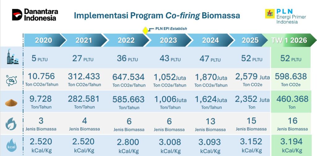 Ecobiz.asia — PT PLN Energi Primer Indonesia (PLN EPI) reported biomass supply for coal-fired power plant (PLTU) cofiring reached 460,368 tons in the first quarter of 2026, marking an increase compared to the same period last year.